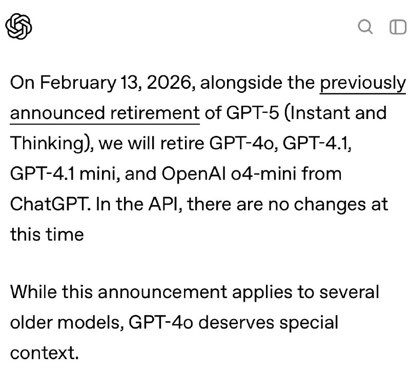 — 13 февраля 2026 года из меню выбора исчезнут модели GPT-4o, GPT-4.1, GPT-4.1 mini, o4-mini, а также GPT-5 (версии Instant и Thinking).