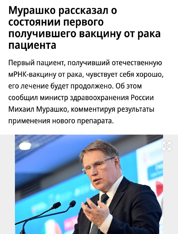 Российская вакцина от рака работает — первый пациент чувствует себя хорошо, заявил министр здравоохранения.
