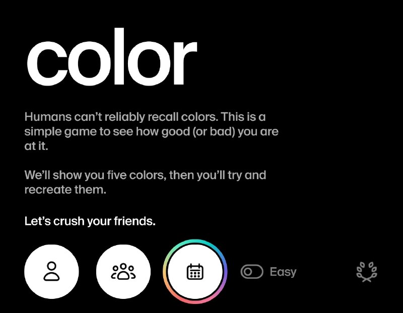Игра простая, но очень затягивающая, особенно если играть с друзьями. Всё, что нужно делать: запомнить цвет за несколько секунд, воспроизвести его и сопоставить с оригиналом, — и так 5 раундов. Есть усложнённый режим — в нём игра будет мешать запомнить цвет.