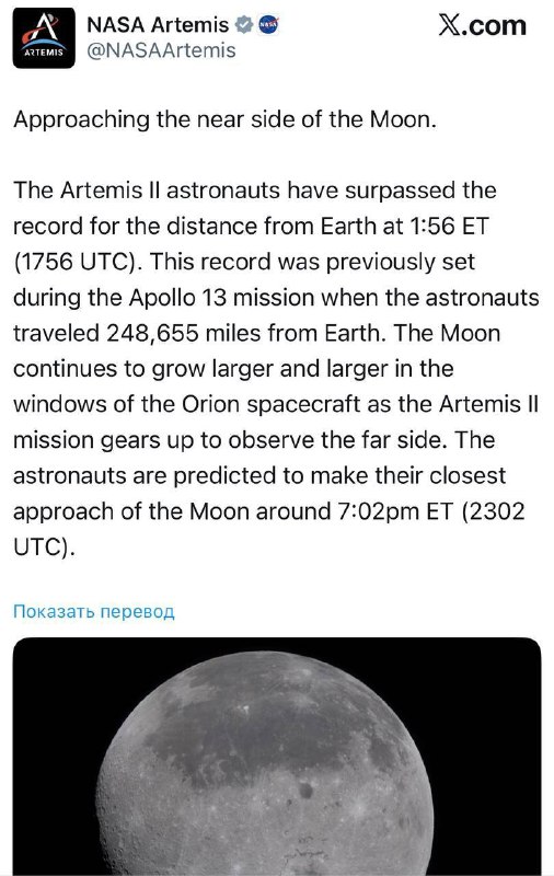 Прямо сейчас Orion подлетает к ближней стороне Луны, это 406 764 км от Земли — для понимания, это 1️⃣0️⃣ кругосветных путешествий.