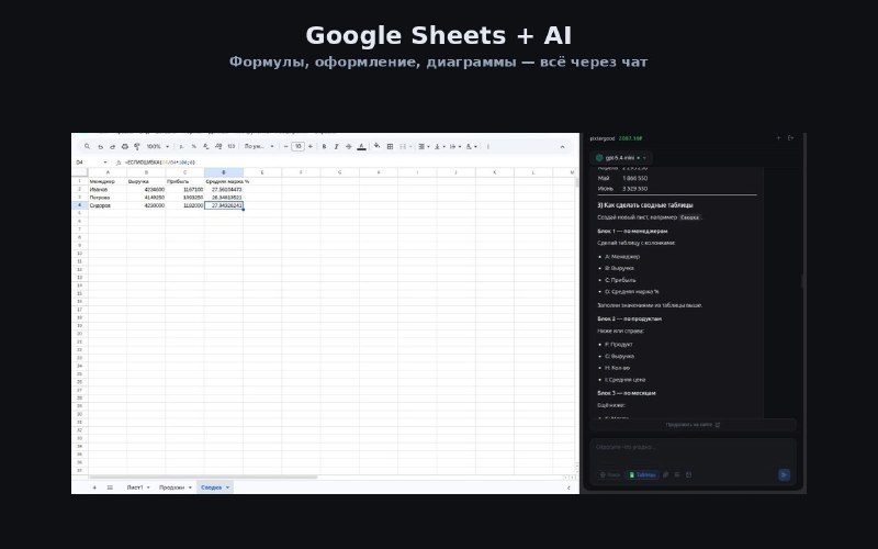 — Интеграция с Гугл таблицами — открываете таблицу, и AI сам заполняет её, пишет формулы, строит диаграммы, оформляет;