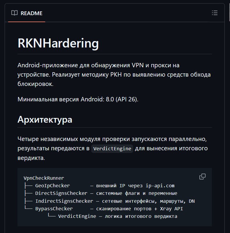 ⚡️ Как быстро РКН спалит ваш VPN: на ГитХаб залили тулзу RKNHardering для Android — она ищет обходы по слитой методичке Роскомнадзора.