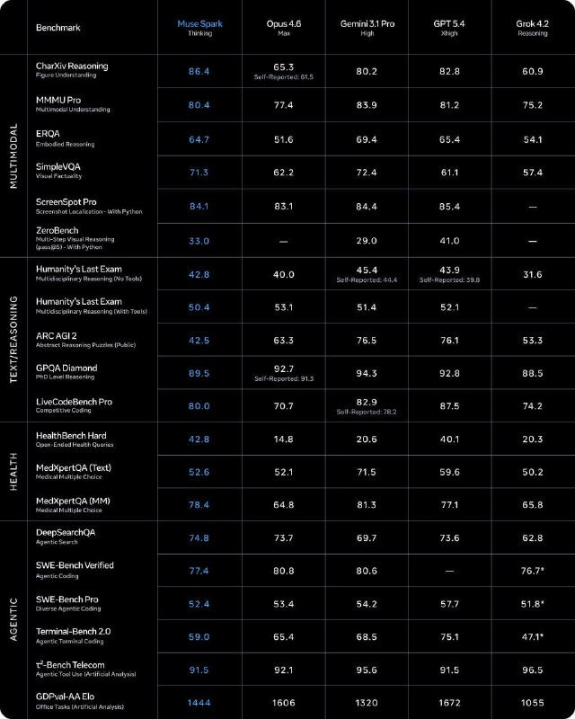 Результаты бенчей приятно удивляют. Это первая размышляющая модель от компании, которая имеет мультиагентный режим, и нацелена на работу в Meta ассистенте, в т.ч. на Meta Rayban Glasses. Из-за этого сделали большой упор на вижн — в нём Muse Spark почти не отстаёт от Gemini 3.1. Также сделали фокус на здоровье, где модель тоже показывает себя очень хорошо. А вот в кодинге заметно отстаёт от топов.