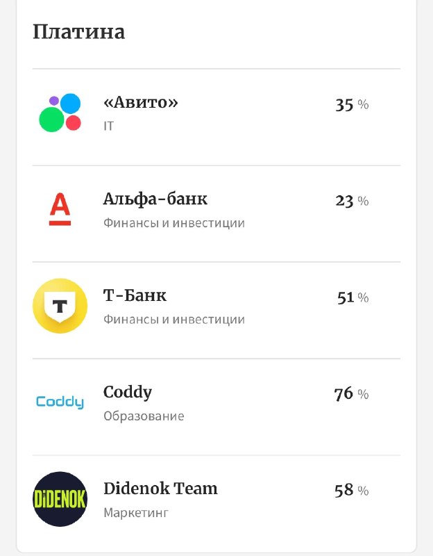 Вышел рейтинг лучших работодателей для молодых спецов Forbes. В наивысшую категорию «платина» взяли всего пять компаний, три из которых известные гиганты: Т-Банк, Авито и Альфа.