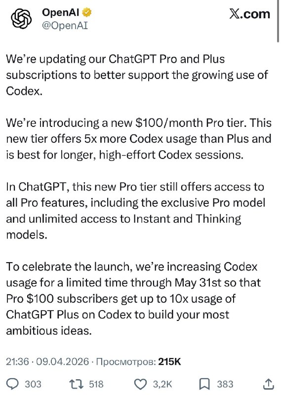 ✴️ OpenAI вводит новый тариф Pro за $100 ради Codex