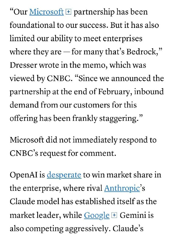 При этом в OpenAI уверены, что рынок остаётся за ними, но признают и свои проблемы. Например, партнёрство с Microsoft, по их мнению, ограничило доступ к части enterprise-сегмента, особенно там, где доминирует AWS (Bedrock).