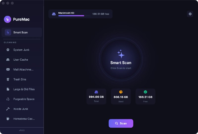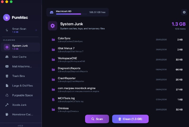 • PureMac сканирует и анализирует все системные файлы за минуту.