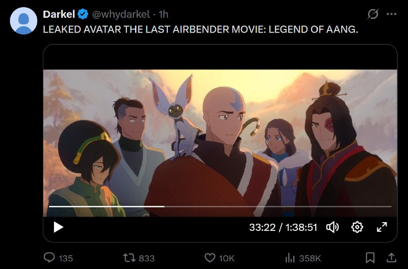 ⚡️ Полнометражку «Легенда об Аанге» только что слили в открытый доступ — целиком! Фильм полностью залили в Твиттер и на Google Drive в отличном качестве. Скоро он будет везде.