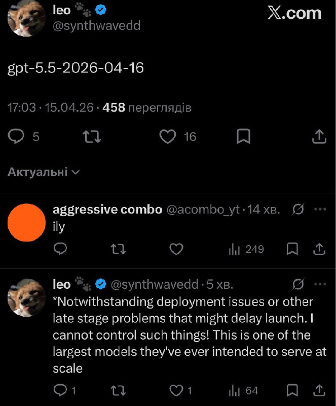 Инсайдер leo, который ранее безошибочно предсказал дату выхода GPT-5.4, слил технический идентификатор (slug) модели GPT-5.5 с датой релиза в названии — 16 апреля. По его словам, задержка возможна только в случае критических багов на этапе развертывания