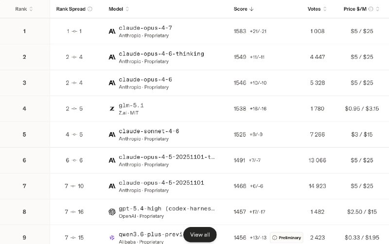 Opus 4.7 набрал 1583 elo по кодированию на arena.ai