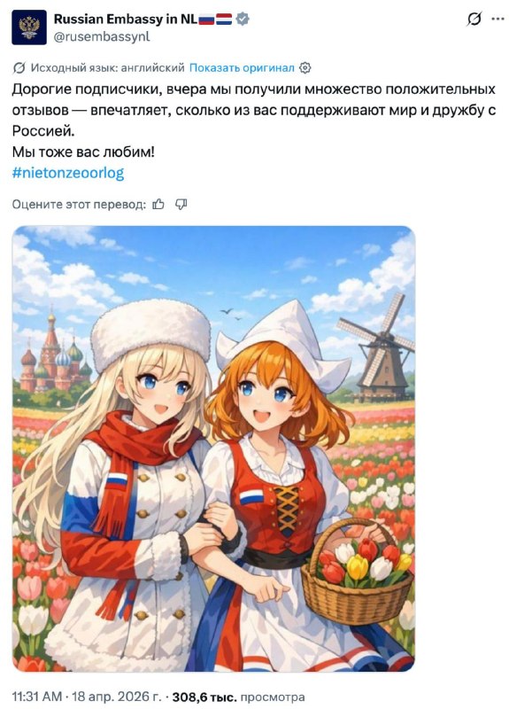 Посольство России в Нидерландах: публикует арт с Россией и Нидерландами в виде аниме-тян