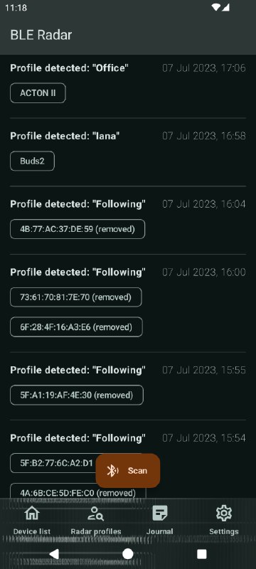 • Находит и в реальном времени отслеживает ВСЕ Bluetooth-устройства поблизости.