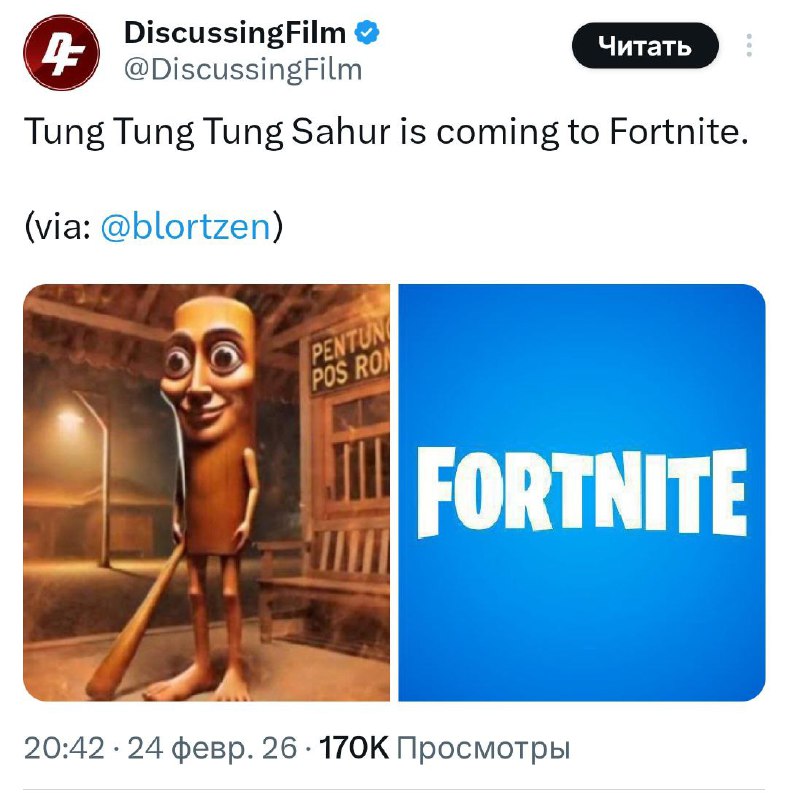 ⚡️ Тун Тун Тун Сахура добавят в FORTNITE — брейнрот героя решили оживить. Теперь геймеры будут отвешивать врагам битой по голове.
