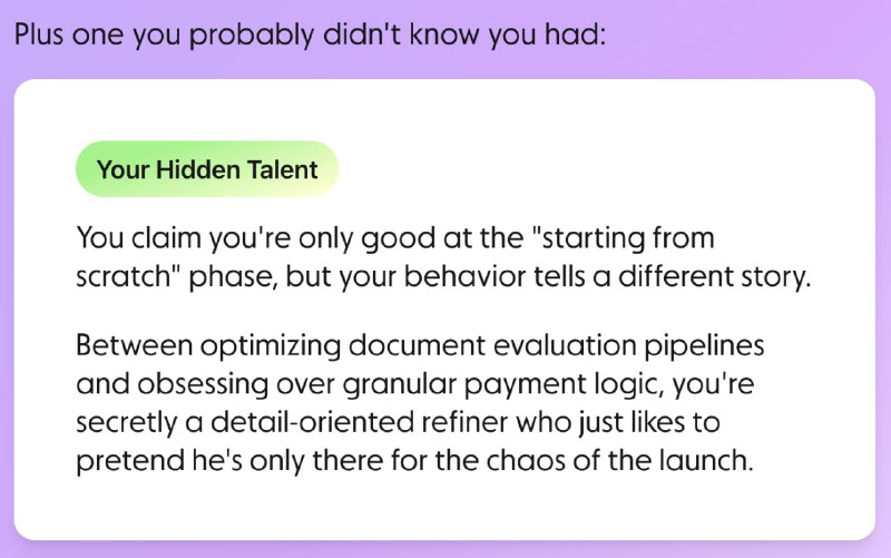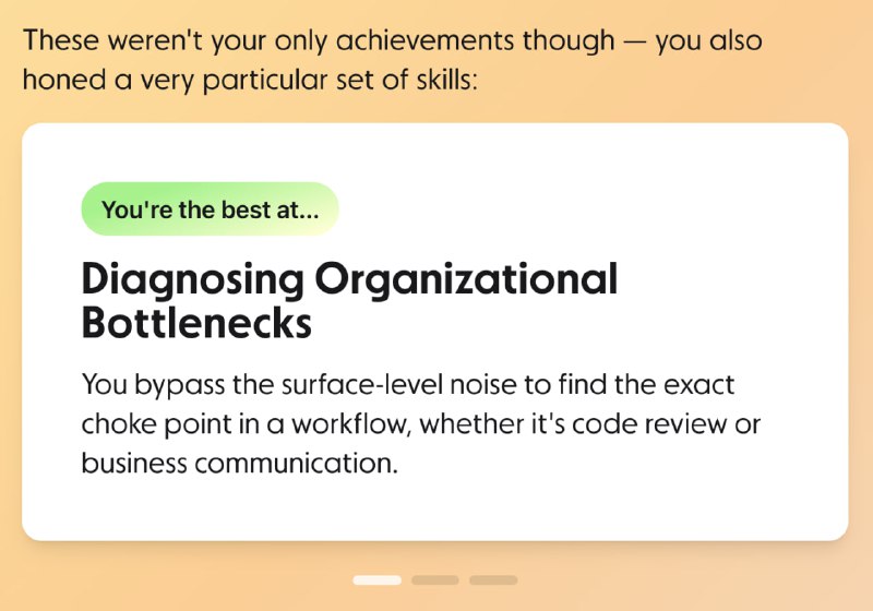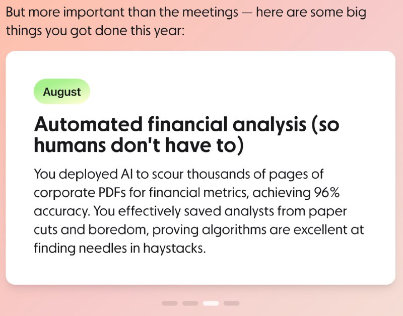 Активность – что-то вроде подведения итогов года – так как у них записи всех моих рабочих звонков с начала июля, то они лучше всех знают, чем я занимался. Понятно, что там в основном просто приятные штуки, где она тебя хвалит, но есть и пара мемов, которые я уже пошерил в слэке с заказчиками, и даже небольшой «психологический» разбор (предпоследний скрин)